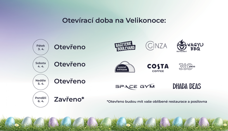 Na Velikonoční pondělí 6. 4. bude OC Spektrum zavřeno, ale Vaše oblíbené restaurace a fitko budou mít otevřeno: