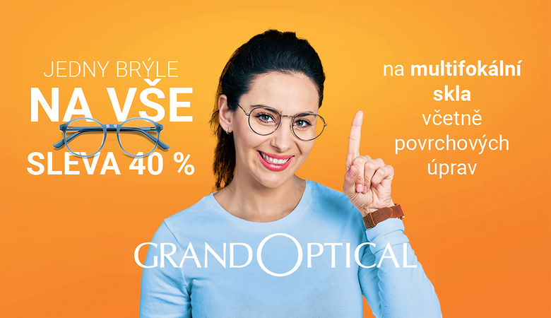 Líbilo by se vám vidět ostře na všechny vzdálenosti? Přijďte si do GrandOptical pro multifokální skla s výraznou slevou 40 %. Skla na blízko nebo do dálky nyní zakoupíte se slevou 20 %. Nabídka platí při nákupu kompletních dioptrických brýlí (obroučky + brýlová skla). Více informací v prodejně GrandOptical nebo na www.grandoptical.cz.