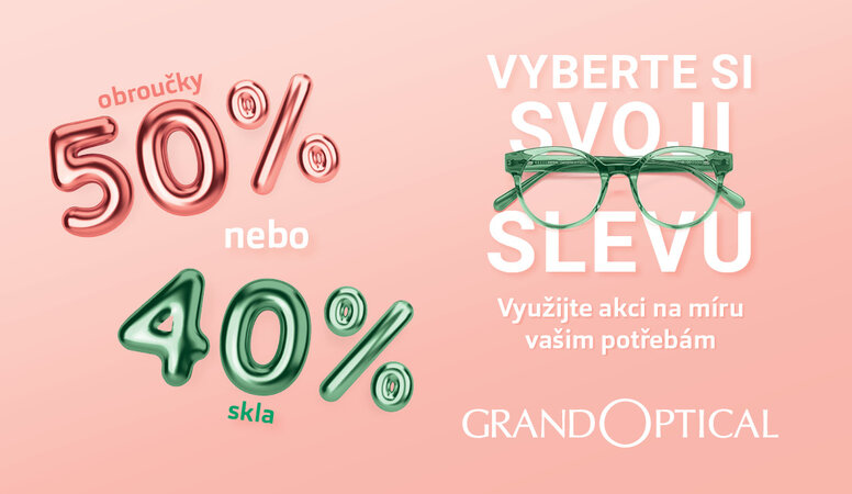 Vyberte si slevu, která ladí s vaším stylem, nebo potřebami. Nyní v GrandOptical sleva 50 % na obroučky, nebo 40 % na skla. Sleva platí při nákupu kompletních dioptrických brýlí (obroučky + brýlová skla). Akci nelze kombinovat ani sčítat s jinými akčními nabídkami a slevovými poukazy. Nabídka platí do odvolání.